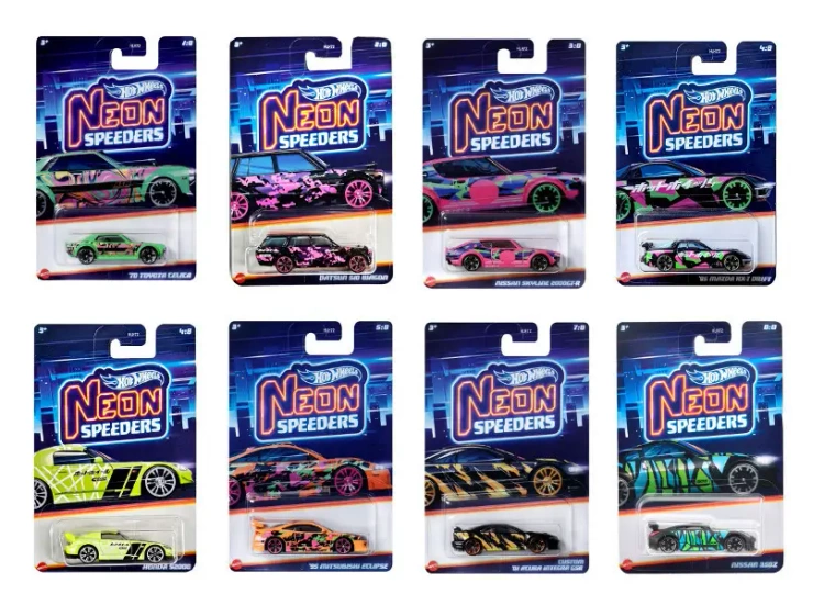 Hot Wheels Neon Speeders to seria odlotowych modeli, które wyróżniają się na tle innych dzięki jaskrawym, przyciągającym uwagę nonowym kolorom. Każdy pojazd w skali 1:64 został wykonany z metalu, posiada unikalne koła oraz bogate zdobienia, które nadają mu wyjątkowego charakteru. Dodatkowo, każdy model zapakowany jest w spersonalizowane opakowanie, co czyni go idealnym do kolekcjonowania. Produkt występuje w kilku wersjach kolorystycznych, wybierany losowo. Cena dotyczy jednej sztuki.