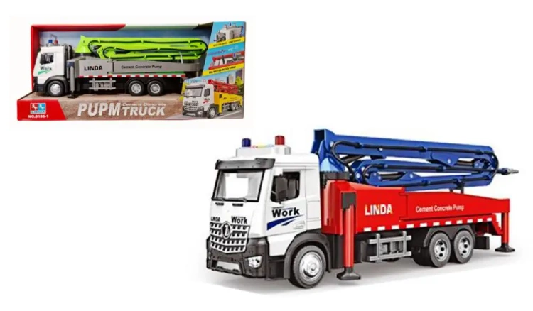 Samochód ciężarowy z ruchomym ramieniem do pompowania betonu. Pompa jest długa na 82 cm, obraca się o 180 stopni. Ponadto auto posiada otwierane drzwi i regulowane nóżki. Model w realistycznym wykonaniu. Dostępne różne wersje kolorystyczne, kolor wybierany losowo. Cena dotyczy jednej sztuki. Zabawka działa na baterie AG13. Baterie znajdują się w zabawce. Produkt zapakowany w kartonowe pudełko. Podane wymiary są wymiarami opakowania.