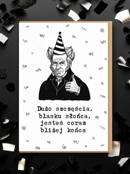 Kartka okolicznościowa SCHOPENHAUER to doskonały prezent dla fana filozofii, czarnego humoru i wszystkiego, co sarkastyczne. Idealna jako kartka urodzinowa dla kolegi, wykładowcy, humanisty czy fana literatury. Sprawdzi się także jako dodatek do prezentu dla kogoś, kto ma podobny vibe co Artur - czyli lubi ponarzekać, ale z klasą.