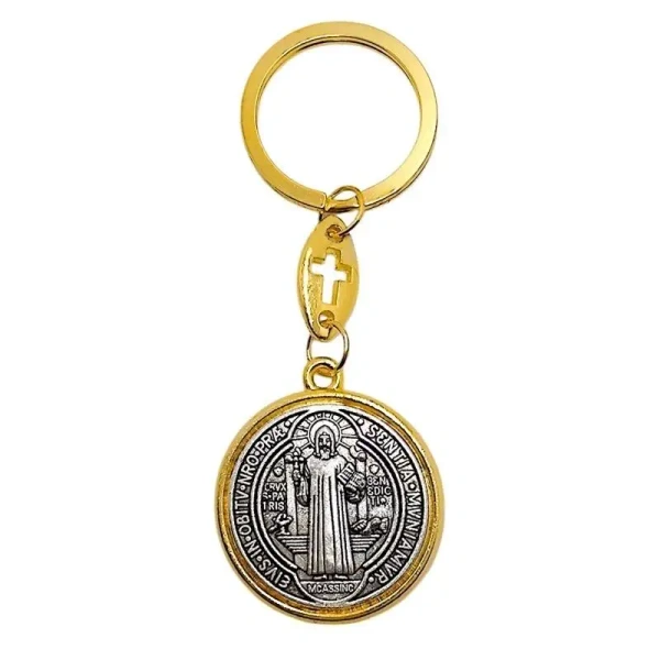 Brelok jest wykonany z trwałego metalu, a jego złoto-srebrne wykończenie nadaje mu szlachetnego i uniwersalnego charakteru. Ma okrągły kształt o średnicy 34 mm, dzięki czemu jest dobrze widoczny, a jednocześnie poręczny. Brelok jest dwustronny - na awersie znajduje się wizerunek Świętego Benedykta, a na rewersie krzyż, który tradycyjnie chroni przed złem.