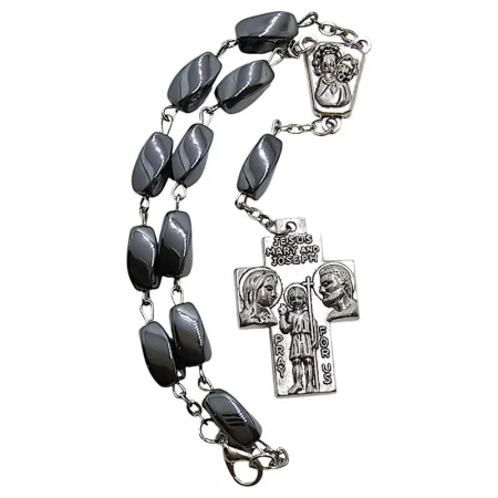Dziesiątka Różańca z Hematytu - Zapinana, z Krzyżem Św. Krzysztofa i Świętej Rodziny, 20 cm