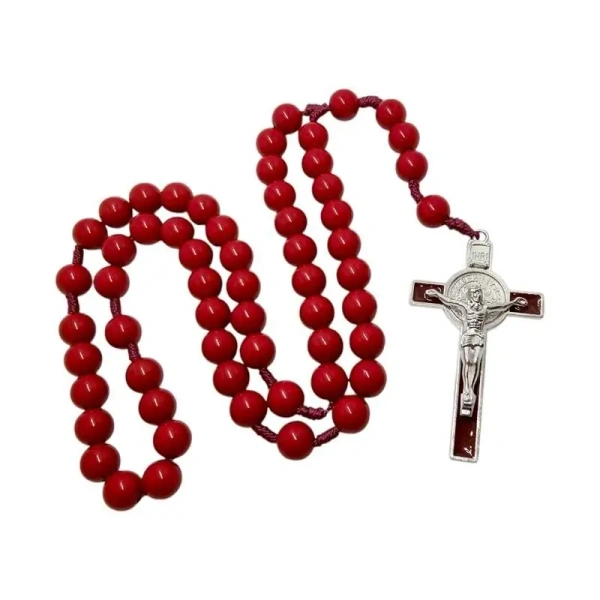 Odkryj prostotę i siłę modlitwy z naszym czerwonym różańcem. Ten pokaźny różaniec wykonany jest z plastiku, ma duże koraliki i piękny metalowy krzyż św. Benedykta w kolorze brązowym. Całość wykonana jest na brązowym sznurku. Różaniec ten jest idealny do modlitwy w zaciszu domowym.