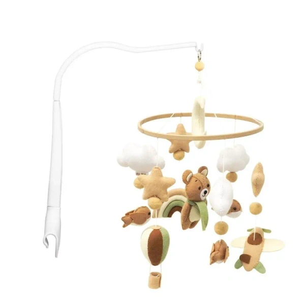 Maskotki w kształcie misiów, ptaszków i gwiazdek zostały ręcznie uszyte z delikatnego filcu i miękkiego wypełnienia. Dzięki temu wyglądają wyjątkowo przytulnie i subtelnie kołyszą się nad łóżeczkiem, wprowadzając do wnętrza ciepło i odrobinę magii dzieciństwa.
