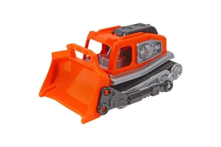 Terenowość i moc buldożera zapewniają gąsienice. Zabawka nie będzie ślizgać się po powierzchni, ponieważ gąsienice mają głębokie ryflowanie i są wykonane z miękkiego tworzywa sztucznego.