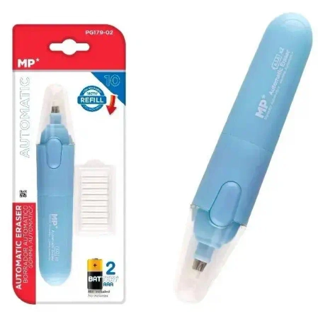 Gumka elektryczna w plastikowym korpusie. Uchwyt z przyciskiem do włączania gumki. Zawiera 10 białych wkładów do ścierania. Guma nietoksyczna. Kolor niebieski.
