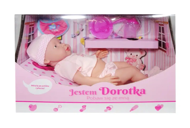Płacze i mówi po polsku (5 zdań: "Przytul mnie, bardzo Cię kocham", "Mamusiu, ukołysz mnie do snu",