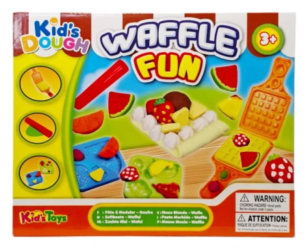 Zestaw do tworzenia apetycznych deserów na bazie gofrów. W zestawie m.in.: 3 kolory ciastolin: (czerwona, żółta i niebieska), gofrownica, a także formy do odduszania owoców.