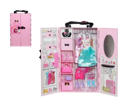 Kolorowa szafa dla lalek kryje w sobie wiele niespodzianek. Posiada w swoim wyposażeniu: lustro, wieszaki, sukienki, buty i torebki. Podane wymiary są wymiarami zamkniętej szafy. Produkt zapakowany w przezroczysty worek.