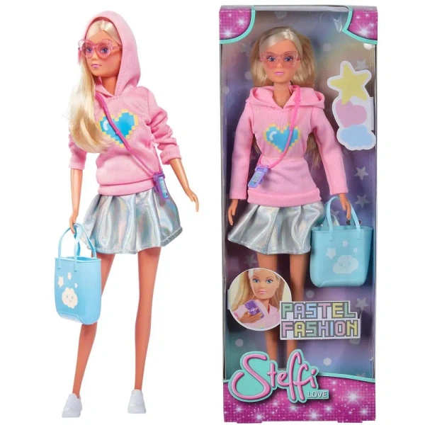 Steffi w zgodzie z najgorętszymi, wiosennymi trendami jest ubrana w pastelową bluzę z kapturem z modnym pikselowym nadrukiem, ma telefon z uchwytem na palec, który jest przewieszony przez ramię na modnym mocowaniu, oczywiście stylizację dopełnia shoppingowa torba i niebieskie włosy.