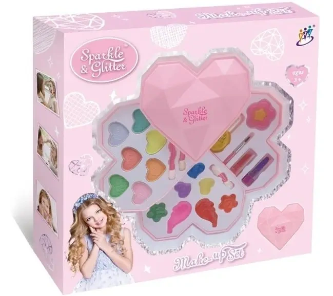 Zestaw kosmetyków dla dzieci Sparkle & Glitter to kompletny zestaw do zabawy, który zachwyca od pierwszego wejrzenia swoim różowym, serduszkowym designem. Wewnątrz rozkładanego pudełka znajduje się szeroki wybór kolorowych kosmetyków, w tym różnobarwne cienie do powiek o różnych teksturach, błyszczyki oraz szminki. Każdy element został starannie umieszczony w przegródkach o uroczych kształtach serc i kwiatów. Do zestawu dołączone są również aplikatory oraz pędzelek, które ułatwiają precyzyjne nakładanie produktów. Całość została zaprojektowana z myślą o bezpieczeństwie najmłodszych użytkowników, oferując im możliwość radosnego eksperymentowania z wyglądem i naśladowania dorosłych. To idealna propozycja na wspólne spędzanie czasu z koleżankami podczas domowego spa, która pobudza artystyczną duszę dziecka.