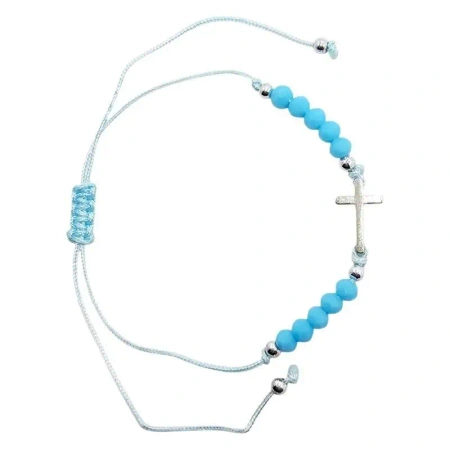 Urocza bransoletka na rękę, będąca jednocześnie praktyczną dziesiątką różańca. Wykonana z trwałego, regulowanego sznurka, dzięki czemu idealnie dopasowuje się do każdego nadgarstka. Dziesiątkę tworzy dziesięć barwnych koralików, które przyciągają wzrok swoją subtelnością. Centralnym elementem bransoletki jest metalowy krzyżyk o wymiarach 13x18 mm. Dodatkowym, subtelnym akcentem są małe, srebrne kuleczki, które pięknie połyskują i dodają bransoletce elegancji. Ta wyjątkowa bransoletka nie tylko ułatwia odmawianie dziesiątki różańca, ale również stanowi stylowy i radosny dodatek do każdej stylizacji.