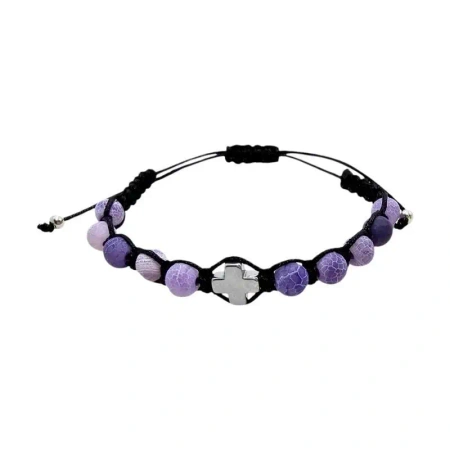 Bransoletka składa się z 10 gładkich koralików z fioletowego kamienia o wielkości 6 mm. Nawleczono je na wytrzymały, czarny sznurek, co zapewnia trwałość i komfort noszenia. Centralnym punktem bransoletki jest minimalistyczny krzyżyk z hematytu o wymiarach 8x8 mm, który nadaje całości subtelnego, a jednocześnie wyraźnego charakteru.