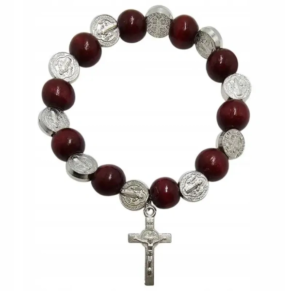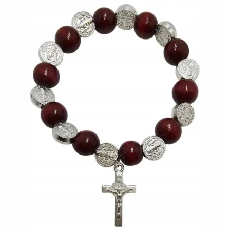 Bransoletka Dziesiątka Różańca św.Benedykta - Bordowe Drewno, Medaliki, Krzyż