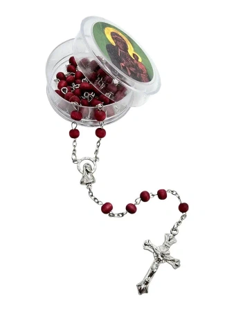 Różaniec ma długość całkowitą 45 cm i obwód 62 cm. Jest wykonany z małych, drewnianych, bordowych kuleczek o wielkości 6 mm, które zostały nawleczone na trwały łańcuszek. Drewno to charakteryzuje się przyjemnym, naturalnym zapachem, który pogłębia doznania podczas modlitwy (różaniec zapachowy).