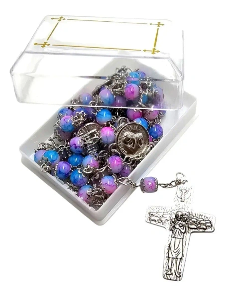 Różaniec niebiesko-różowy w pudełku ze świętymi - Art Sacrum
