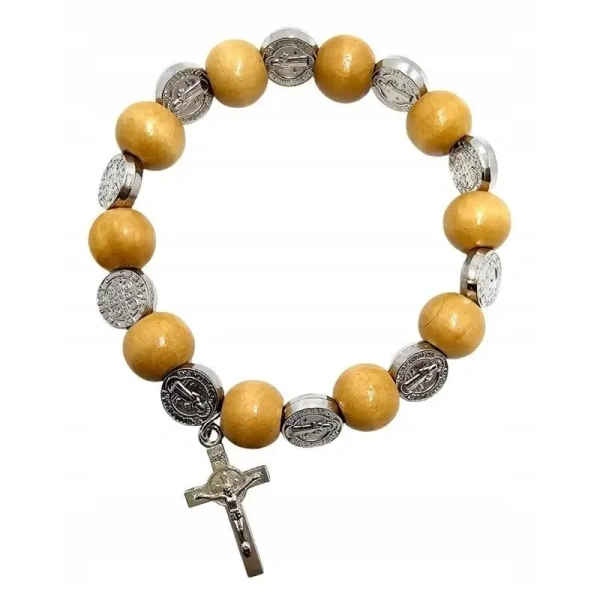Bransoletka Dziesiątka Różańca św.Benedykta - Beżowe Drewno, Medaliki, Krzyż.