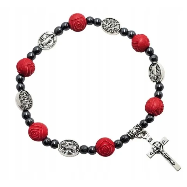 Odkryj piękno z tą wyjątkową bransoletką. Czerwone koraliki w kształcie róży, symbolizujące miłość i ofiarę, są przeplatane medalikami św. Benedykta, które chronią przed złem. Małe kuleczki hematytu, umieszczone między medalikami, a koralikami, dodają bransoletce elegancji i siły. Niewielki metalowy krzyż, przymocowany do bransoletki, jest symbolem wiary i ofiary Chrystusa. Bransoletka, wykonana na elastycznej gumce, ma obwód około 20 cm i składa się z jedenastu koralików. To idealny dodatek dla osób, które chcą mieć przy sobie symbol wiary.