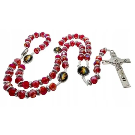Odkryj piękno i głębię modlitwy z naszym wyjątkowym, czerwonym kryształowym różańcem. Wykonany z efektownych, szklanych koralików o wielkości 10 mm, które wspaniale odbijają światło. Każda dziesiątka różańca oddzielona jest metalowym medalikiem z wizerunkiem Jezusa Miłosiernego z obrazu św. Faustyny Kowalskiej "Jezu Ufam Tobie". Dodatkowo, każdy kryształowy koralik jest ozdobiony i oddzielony od siebie drobnym, srebrnym elementem z plastiku, co nadaje mu unikalny charakter. Różaniec o długości 52 cm zwieńczony jest metalowym krzyżem o wymiarach 68x40 mm. Całość wykonana jest na trwałymsznurku. To elegancki i pełen duchowego znaczenia różaniec, idealny do codziennej modlitwy i jako wyjątkowy prezent.