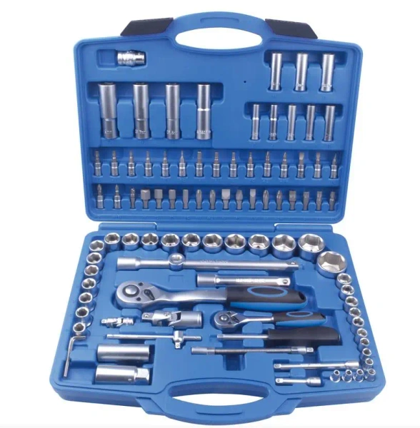 Zestaw kluczy zawiera: . Narzędzia 1/4": 1 szt. - grzechotka prosta 1/4" 72-zęby, z przełącznikiem kierunku pracy oraz przyciskiem szybko mocującym; 13 szt. - nasadki 1/4" 6kt.: 4, 4.5, 5, 5.5, 6, 7, 8, 9, 10, 11, 12, 13, 14 mm 8 szt. - nasadki długie 1/4" 6kt.: 6, 7, 8, 9, 10, 11, 12, 13 mm 2 szt. - przedłużki 1/4" L-50, L-100 1 szt. - pokrętło z przetyczką 1/4" 1 szt. - przegub 1/4" 1 szt. - pokrętło wkrętakowe 1/4" 3 szt. - klucze ampulowe gięte: 1.5, 2, 2.5mm . Narzędzia 1/2": 1szt. -solidna grzechotka o wygiętym profilu 1/2" 72-zęby, z przełącznikiem kierunku pracy oraz przyciskiem szybko mocującym 17 szt. - nasadki 1/2" 6kt.: 10, 11, 12, 13, 14, 15, 16, 17, 18, 19, 20, 21, 22, 24, 27, 30, 32mm 5 szt. - nasadki długie 1/2" 6kt.: 14, 15, 17, 19, 22mm2szt. - przedłużki 1/2" L-125, L-250 2 szt. - nasadki do świec 1/2" : 16 i 21mm 1 szt. - redukcja 3/8" (F) x 1/2" (M) 1 szt. - przegub 1/2" 1 szt. - adapter 1/2" x 5/16" . Końcówki: 18 szt. końcówek 1/4” typu bit (L-32mm) z nasadką 1”: Ampulowe: 3, 4, 5, 6mm Torx: T8, T10, T15, T20, T25, T27, T30 Płaskie: 4, 5.5, 6.5mm Krzyżakowe: PH1, PH2 POZI: PZ1, PZ2 16 szt. końcówek 5/16” typu bit (L-30mm): Ampulowe: 7, 8, 10, 12, 14mm Torx: T40, T45, T50, T55 Płaskie: 8, 10, 12mm Krzyżakowe: PH3, PH4 POZI: PZ3, PZ4