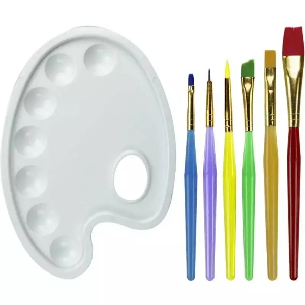 W zestawie jest paletka do mieszania farb i pędzle.