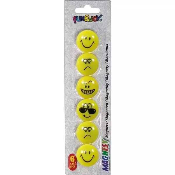 W opakowaniu jest zestaw okrągłych magnesów w kolorze żółtym z motywem uśmiechniętych buziek.