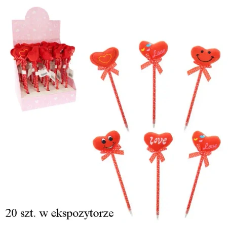 Efektowny długopis ozdobny, który łączy funkcjonalność z urokiem romantycznej dekoracji. Korpus długopisu pokryty jest tkaniną w czerwonym kolorze w białe kropeczki, co nadaje mu lekkości i wesołego charakteru. Na szczycie długopisu znajduje się miękkie, tekstylne serduszko o wymiarach 6 × 5,5 cm, ozdobione haftem z napisem “Love” oraz drobnymi kolorowymi aplikacjami w kształcie serduszek. Całość dopełnia urocza kokardka z dopasowanej tasiemki. Długopis ma długość całkowitą około 22 cm i stanow