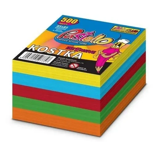Kostka nieklejona kolorowa INTENSYWNA, wymiar 85x85 500 kartek. Wykonana z papieru PREMIUM barwionego w masie. Wykorzystywana do notatek i zapisków. Również do origami. Może służyć jako samodzielny bloczek lub wkład do pojemnika. Doskonały do biura, szkoły lub domu.