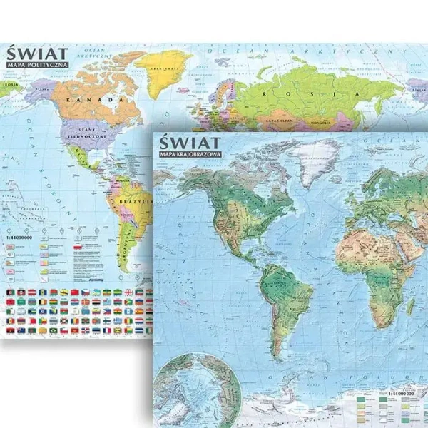 Solidna i dwustronnie laminowana ścienna mapa świata będzie zarówno cenną pomocą w nauce i zabawie, jak i interesującą ozdobą pokoju. Po jednej stronie znajduje się mapa polityczna, na odwrocie – mapa krajobrazowa.