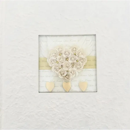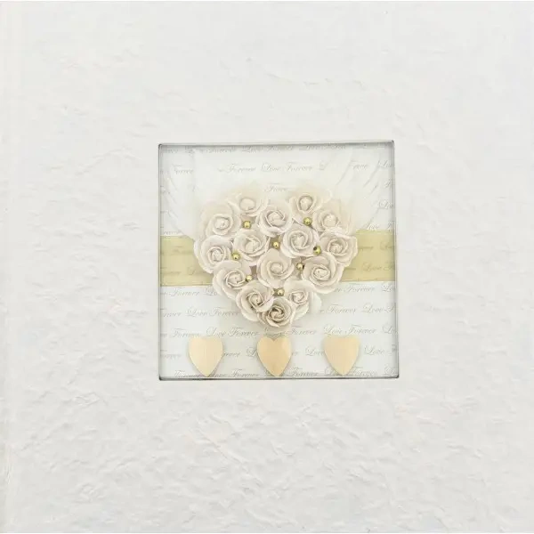 Centralną część okładki zdobi dekoracyjna aplikacja z motywem serca ułożonego z jasnych, kremowych róż, uzupełniona delikatnymi skrzydłami oraz subtelnymi złotymi akcentami. W tle widoczny jest romantyczny napis „Love Forever”, który dodaje całości ciepłego, sentymentalnego wyrazu. Dolną część kompozycji dopełniają trzy złote serduszka, podkreślające harmonijny styl albumu.