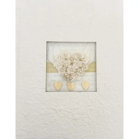 Centralną część okładki zdobi dekoracyjna aplikacja z motywem serca ułożonego z jasnych, kremowych róż, uzupełniona delikatnymi skrzydłami oraz subtelnymi złotymi akcentami. W tle widoczny jest romantyczny napis „Love Forever”, który nadaje całości ciepły, sentymentalny charakter. Dolną część kompozycji dopełniają trzy złote serduszka, harmonijnie współgrające z naturalną strukturą papieru czerpanego.