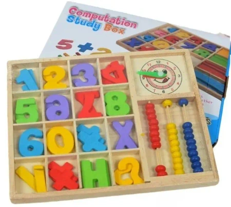 Kolorowy zestaw edukacyjny Computation Study Box to kompleksowa pomoc dydaktyczna wykonana z naturalnego drewna. Został zaprojektowany w taki sposób, aby ułatwić dziecku przyswajanie podstawowych pojęć matematycznych oraz naukę odczytywania godzin. Główną część zestawu stanowią estetyczne, drewniane klocki w kształcie cyfr oraz symboli matematycznych, takich jak plus, minus czy znak równości, co pozwala na układanie i rozwiązywanie pierwszych równań. Prawa strona pudełka zawiera wbudowany zegar z uśmiechniętą buzią, który pomaga w zrozumieniu upływu czasu, oraz trzy rzędy koralików służących jako tradycyjne liczydło do wizualizacji obliczeń. Dzięki żywej kolorystyce zabawka przyciąga uwagę, stymuluje wzrok i zachęca do samodzielnych ćwiczeń. Drewniana konstrukcja gwarantuje trwałość i bezpieczeństwo podczas codziennego użytkowania, a praktyczne przegródki uczą dziecko utrzymywania porządku po zakończonej zabawie.