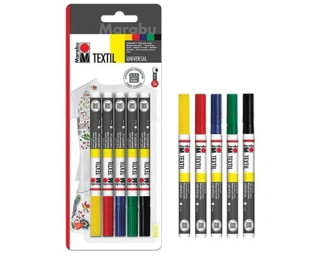 Zestaw 5 markerów w podstawowych kolorach do jasnych tkanin firmy Marabu. Markery nadają się do wszystkich jasnych tkanin, zarówno naturalnych jak i syntetycznych. Napełnione wodną farbą o przyjemnym zapachu, są całkowicie bezpieczne dla dzieci. Po namalowaniu należy odłożyć tkaninę do wyschnięcia, a następnie wyprasować (bez pary) po lewej stronie. Pomalowane tkaniny można prać w temp. 60 C