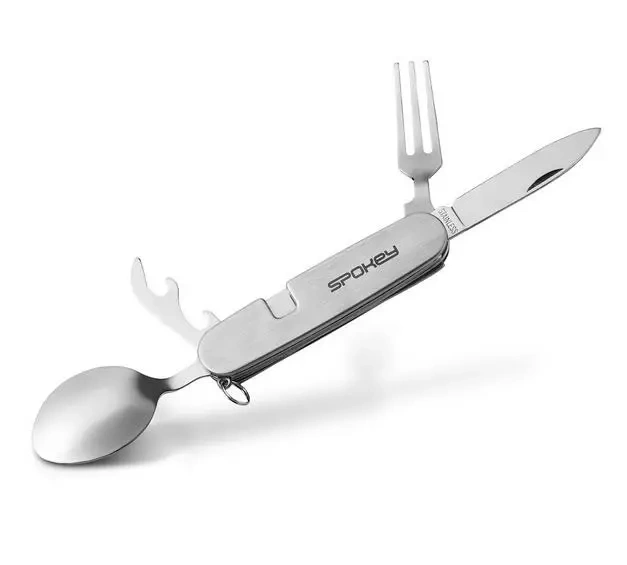 Lekki i poręczny niezbędnik sztućców turystycznych typu 4w1, składający się z łyżki, widelca, noża i otwieracza. Wykonany z nierdzewnej stali, sprawdzi się idealnie podczas biwaków, wycieczek i wszelki outdoorowych aktywności.