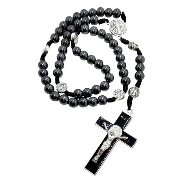 Każda dziesiątka różańca jest oddzielona medalikami Świętego Benedykta, co zwiększa jego duchowe znaczenie i przypomina o potędze modlitwy. Zwieńczeniem całości jest okazały czarny krzyż z metalu o wymiarach 55x33 mm, również zdobiony medalikiem Świętego Benedykta, stanowiący centralny punkt tej wyjątkowej kompozycji.