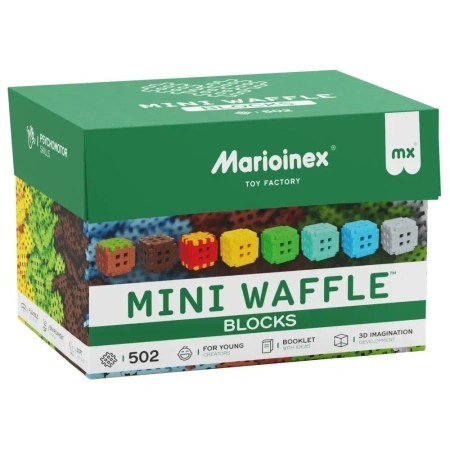 Mini Waffle Blocks 502 oferuje aż 502 elementy, które tworzą najbardziej imponującą kolekcję barw: soczystą trawę, stabilną ziemię, chłodną stal, mieniące się kryształy, iskrzącą lawę, czystą wodę, błyszczące złoto i wyjątkowy, drogocenny zielony minerał dostępny tylko w tym zestawie.