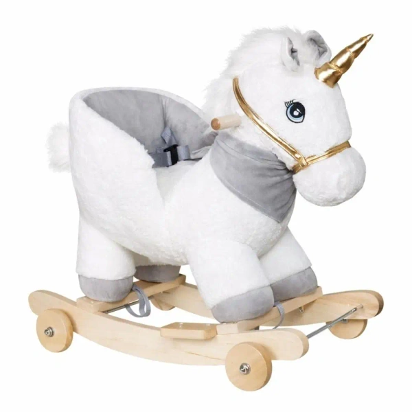 Miękka pluszowa tkanina jest przyjemna w dotyku i zapewnia wysoki komfort użytkowania, a solidna konstrukcja oparta na drewnianych płozach gwarantuje stabilność podczas bujania. Jednorożec został wyposażony w wygodne oparcie oraz uchwyty, które pomagają dziecku utrzymać prawidłową pozycję ciała i zwiększają bezpieczeństwo zabawy.