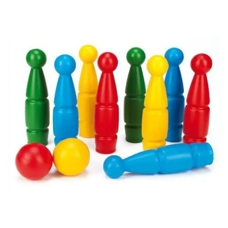 Zestaw zawiera dziewięć barwnych kręgli i dwie kule, które łatwo chwycić w małe ręce. Komplet zapakowany jest w praktyczny karton, co umożliwia łatwe przechowywanie elementów gry.