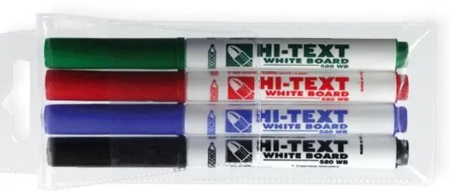 Zestaw czterech, kolorowych mazaków suchościeralnych świadczą o solidności i wytrzymałości serii produkcyjnej HI-TEXT. Modele oznaczone jako 580 mają mazaki o okrągłych końcówkach o średnicy 6 mm. Tusz stosowany w tych mazakach utwardza się błyskawicznie, gwarantując szybkie przygotowanie notatek czy rysunków bez obawy o rozmazanie. Równocześnie, jest również nietoksyczny i bezzapachowy, wpływając korzystnie na bezpieczeństwo i wygodę użytkowania mazaków.Łatwo zmywalne