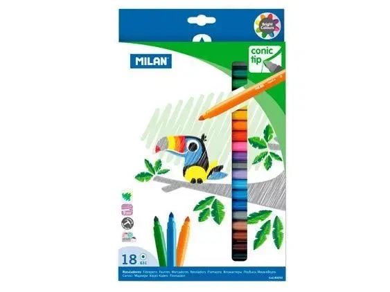 MILAN prezentuje zestaw 18 flamastrow z unikalnymi, stożkowymi końcówkami - niezwykle wytrzymałymi i elastycznymi, zapewniającymi bezproblemowe rysowanie nawet przy intensywnym nacisku. Wyposażone w końcówki o średnicy 5 mm, które po chwilowej deformacji, zawsze powracają do swojego pierwotnego kształtu.Szeroki zakres grubości linii