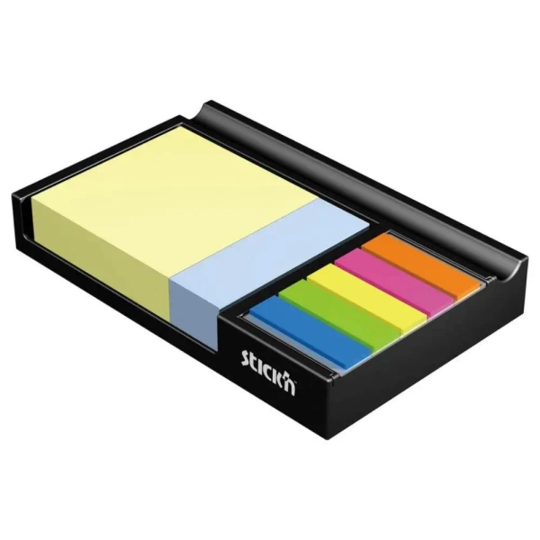 Prezentujemy użyteczny i funkcjonalny przybornik biurkowy z karteczkami, idealny zarówno do użytku domowego, jak i biurowego. W zestawie znajdują się różnorodne notesy i zakładki, które ułatwią organizację pracy oraz pomogą w przypominaniu ważnych informacji. W skład zestawu wchodzą:- Żółty pastelowy notes o wymiarach 76x76mm, liczący 200 karteczek, doskonały do notowania szybkich notatek czy przypomnień;