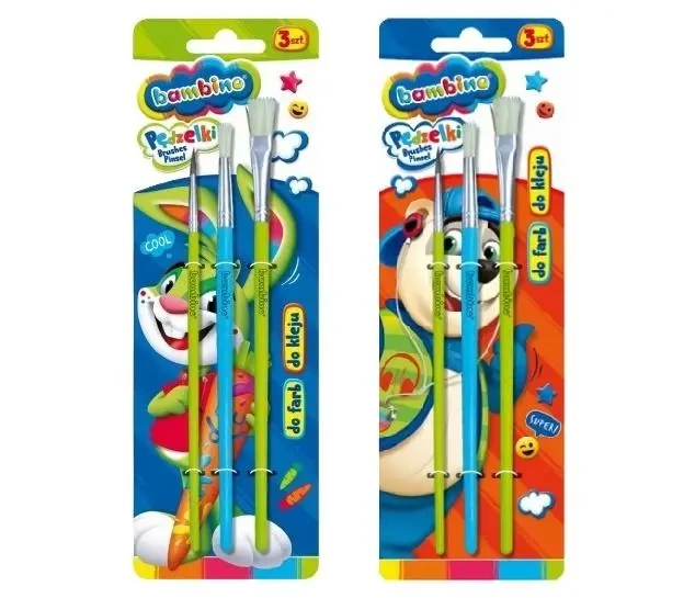 Prezentowany praktyczny i uniwersalny zestaw trzech pędzelków szkolnych obejmuje rozmiary: 4, 8, 16. Pędzelki te świetnie nadają się do pracy z różnymi rodzajami farb, takimi jak akwarela czy plakatówki. Można je również wykorzystać do aplikacji kleju. Produkty są objęte licencją Bambino, a w zestawie znajdują się 3 pędzelki.