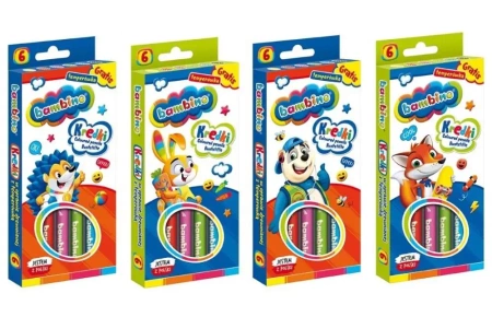 Ilość dostępnych kolorów - 6. Liczba kredek w każdym opakowaniu - 6. Wyróżnikiem kredek są ich przekrój, wynoszący 7 mm oraz dołączona do zestawu temperówka.EAN: 5903235000232