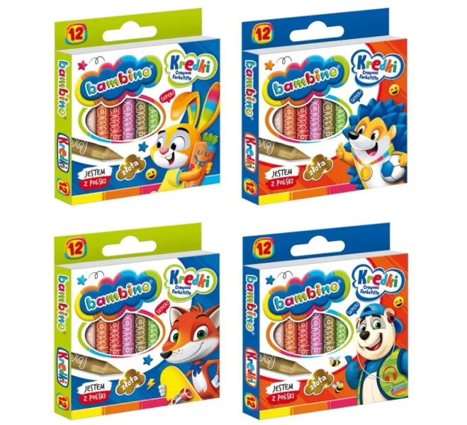 Te kredki to produkt najwyższej jakości, towarzyszący dzieciom na przestrzeni pokoleń. Są jednoznacznie rozpoznawalne dzięki intensywnym i nasyconym barwom, jak również doskonałemu pokryciu powierzchni. Idealnie do rysowania, wypełniania dużych powierzchni oraz tworzenia subtelnego przejścia kolorów. Kredki Bambino są zrobione z glinki kaolinowej - to, co niezaprzeczalnie podnosi ich wartość użytkową w porównaniu do kredek woskowych czy ołówkowych. Każda kredka posiada papierową owijkę z własnym nadrukiem (każda zawiera grafikę innego zwierzaka).