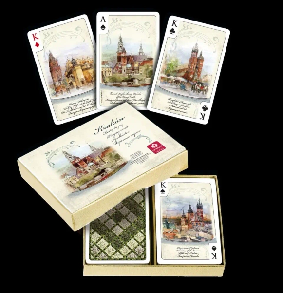 Zestaw kart do gry zawierający artystyczne akwarele, które ukazują malowniczą scenerię polskiego miasta - Krakowa. W skład zestawu wchodzą dwie talie, każda składa się z 55 kart.EAN: 5901911001566