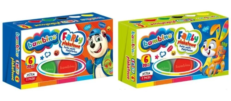 To oferty prezentują różnorodne wzory, a konkretny wybór jest wysyłany w sposób losowy. Farby plakatowe Bambino charakteryzują się czystymi i nasyconymi kolorami. Można je używać bez dodatku wody, ponieważ nie skrapiają podłoża na którym są stosowane. Po wyschnięciu dają matowy efekt z intensywnym kolorystycznym odznaczeniem, które jest odporne na światło i ścieranie.