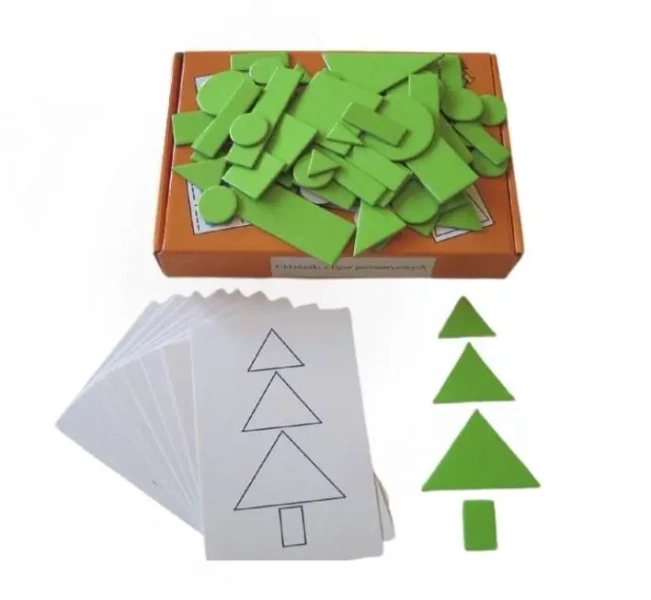 Zestaw Układanki z figur geometrycznych służy do opanowania umiejętności układania wg wzoru obrazów z figur geometrycznych ( trójkat, koło, prostokąt, kwadrat), układania tych obrazów z pamięci oraz rozwijaniu wyobraźni poprzez tworzenie własnych kompozycji. Dziecko utrwala nazwy figur geometrycznych oraz różnicuje ich wielkości.