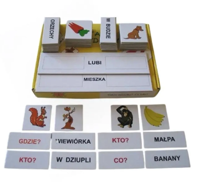 Zestaw plakietek i etykietek służy do przenoszenia obrazów z rzeczywistości na obrazki, uświadamianiu dziecku, że słowo (napis) oznacza konkretną rzecz, czynność czy sytuację oraz do nauki czytania. Uczy dziecko rozumienia pytań oraz udzielania odpowiedzi.Zestaw ten składa się z dwóch oddzielnych zestawów ćwiczeniowych (Gdzie mieszka? i Co lubi?)Zestawy te służą do nauki dopasowywania elementów w postaci schematu do obrazka, odpowiedzi obrazkiem lub etykietką na pytania np.: Gdzie mieszka? Kto mieszka? (Co lubi? Kto lubi?) i nauki zdań (układania ich) zawierających pewną informację. Osiągamy tu też czytanie pełnymi wyrazami (czytanie globalne) i pełnymi zdaniami. - 2 plansze (szablon)