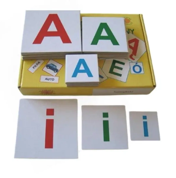 Zestaw służy do nauki czytania i pisania prostym drukiem samogłosek oraz klasyfikacji liter w odróżnieniu od wielkości i koloru.
