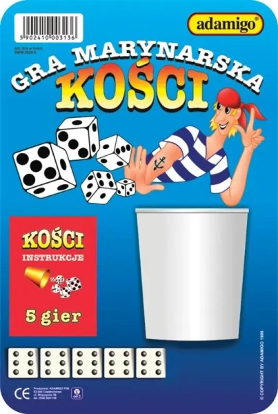 Zestaw do gry marynarskiej w kości od Adamigo składa się z 5 kości, dołączonego kubka oraz instrukcji opisującej reguły pięciu różnych gier.