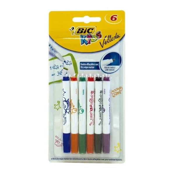Kids Velleda to zestaw sześciu mini markerów od firmy BIC - specjalnie zaprojektowane do tablic suchościeralnych. Piękno tablicy suchościeralnej leży w możliwości wielokrotnego pisania i wymazywania treści. Dlatego też właśnie te pisaki doskonale sprawdzą się z tą rolą. Wyróżniają się neutralnym zapachem, co jest ważne podczas długotrwałego rysowania czy pisania. Po każdym użyciu pamiętaj, aby dokładnie nałożyć skuwkę - dzięki temu pisak nie wyschnie i będziesz mógł cieszyć się nim dłużej. Markery są dostępne w sześciu kolorach, które zawarte są w jednym zbiorczym opakowaniu. To daje dzieciom możliwość wyboru koloru odpowiedniego do ich potrzeb, czy to podczas nauki, kreatywnego rysowania czy zwykłej zabawy.EAN: 3086126707426